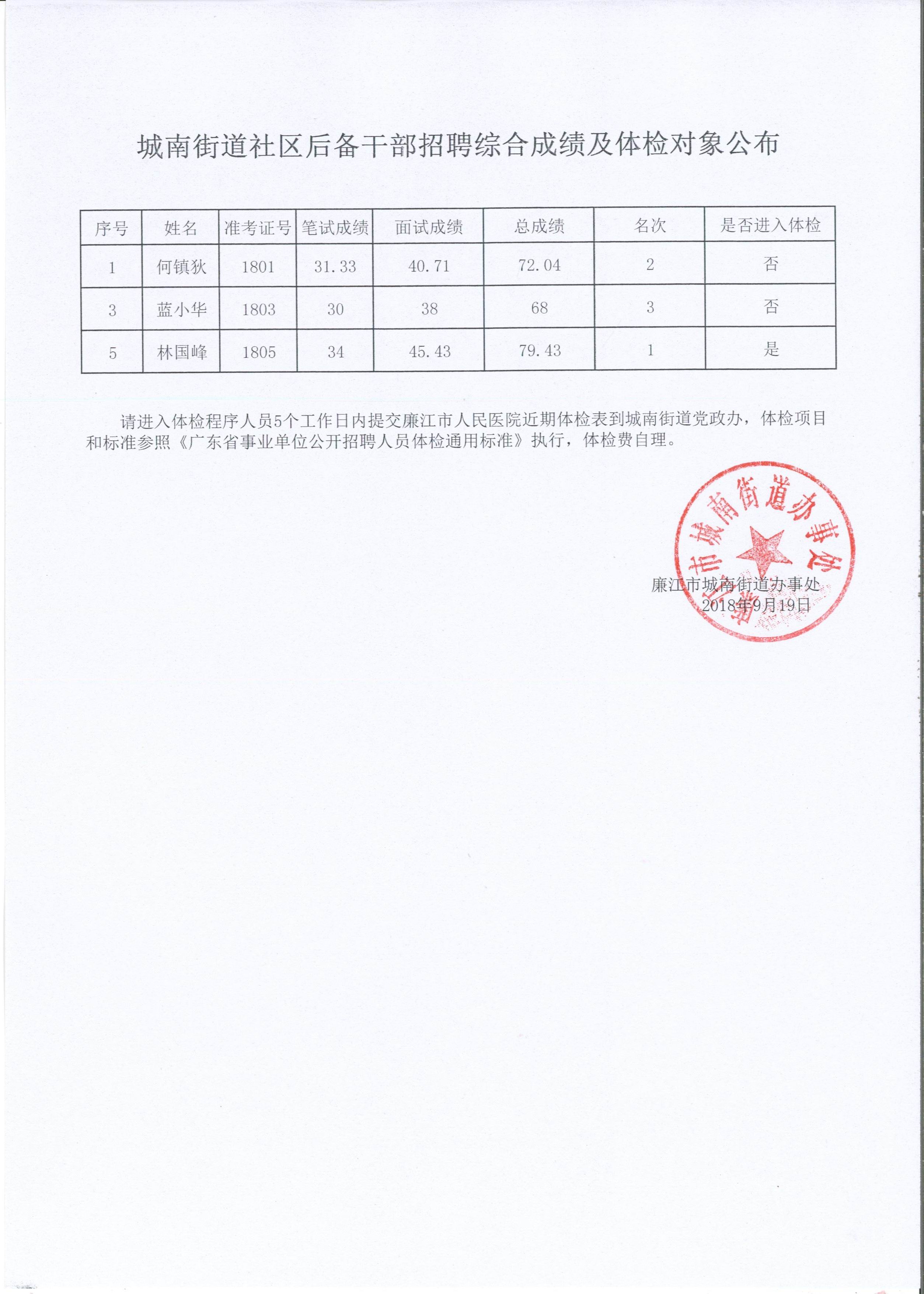 城南街道社区后备干部招聘综合成绩及体检对象公布