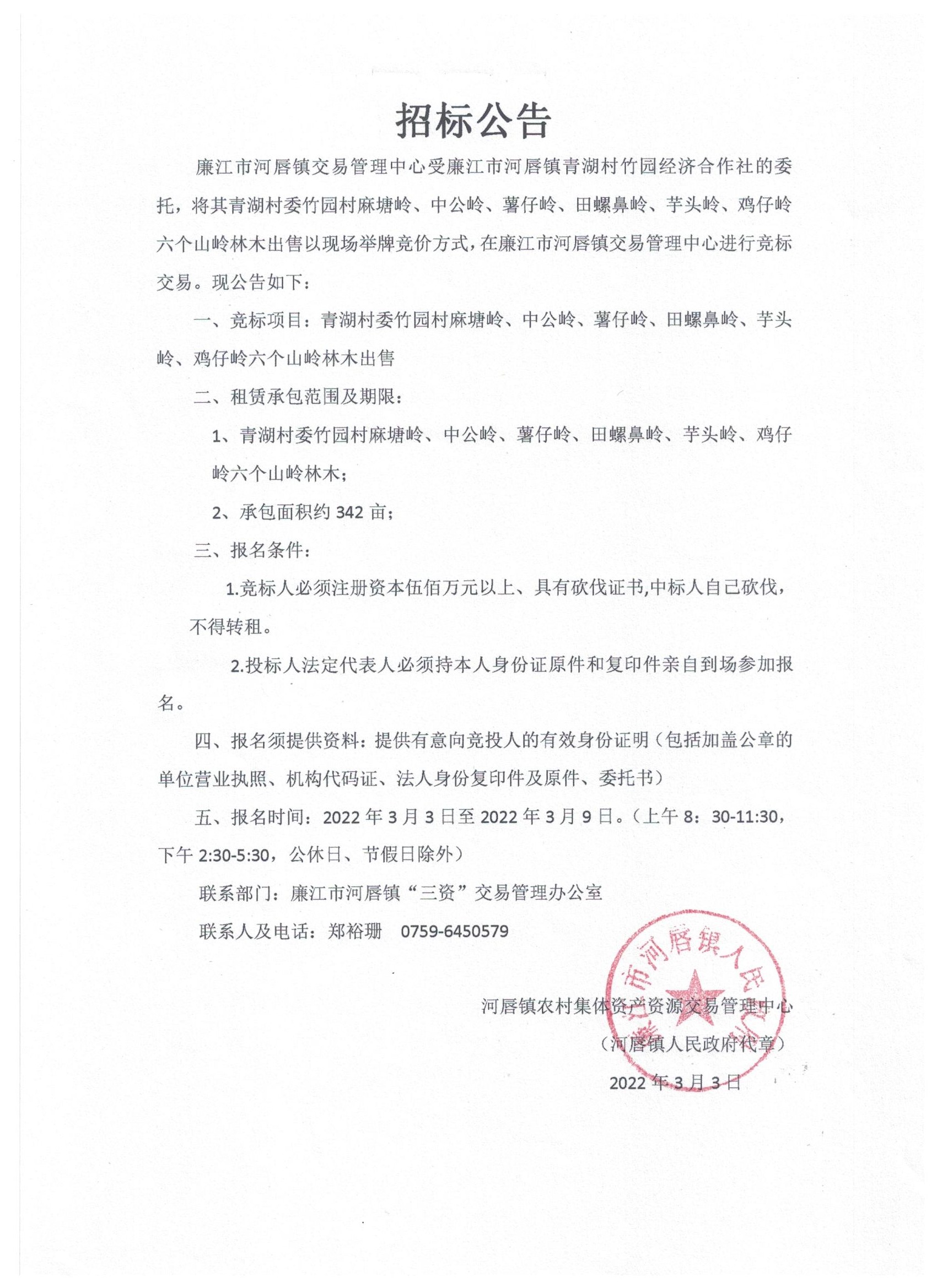 关于青湖村委竹园村麻塘岭、中公岭、薯仔岭、田螺鼻岭、芋头岭、鸡仔岭六个山岭林木出售招标公告