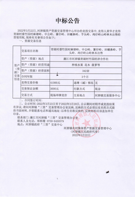 青湖村委竹园村麻塘岭、中公岭、薯仔岭、田螺鼻岭、芋头岭、鸡仔岭山岭林木出售中标公告