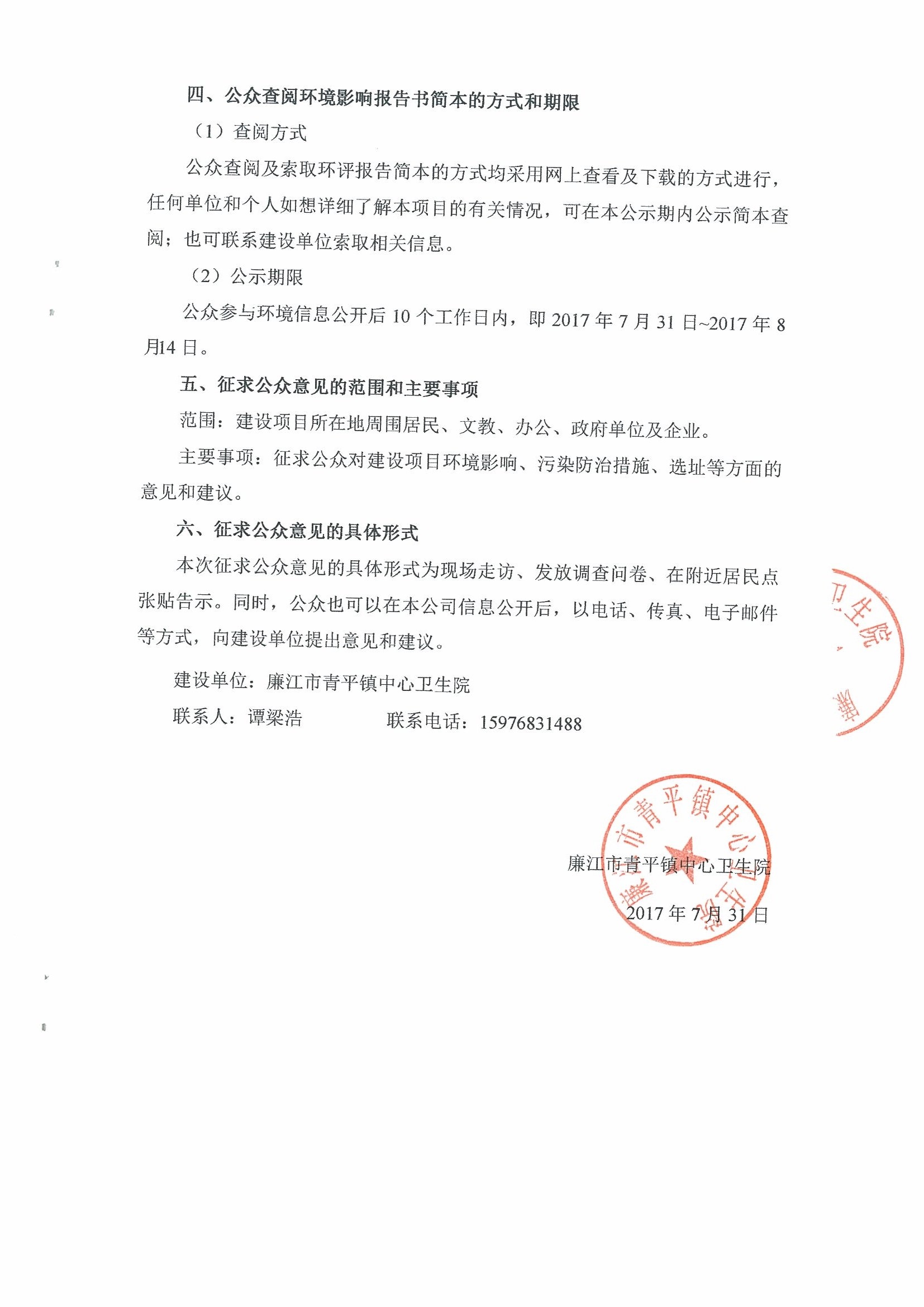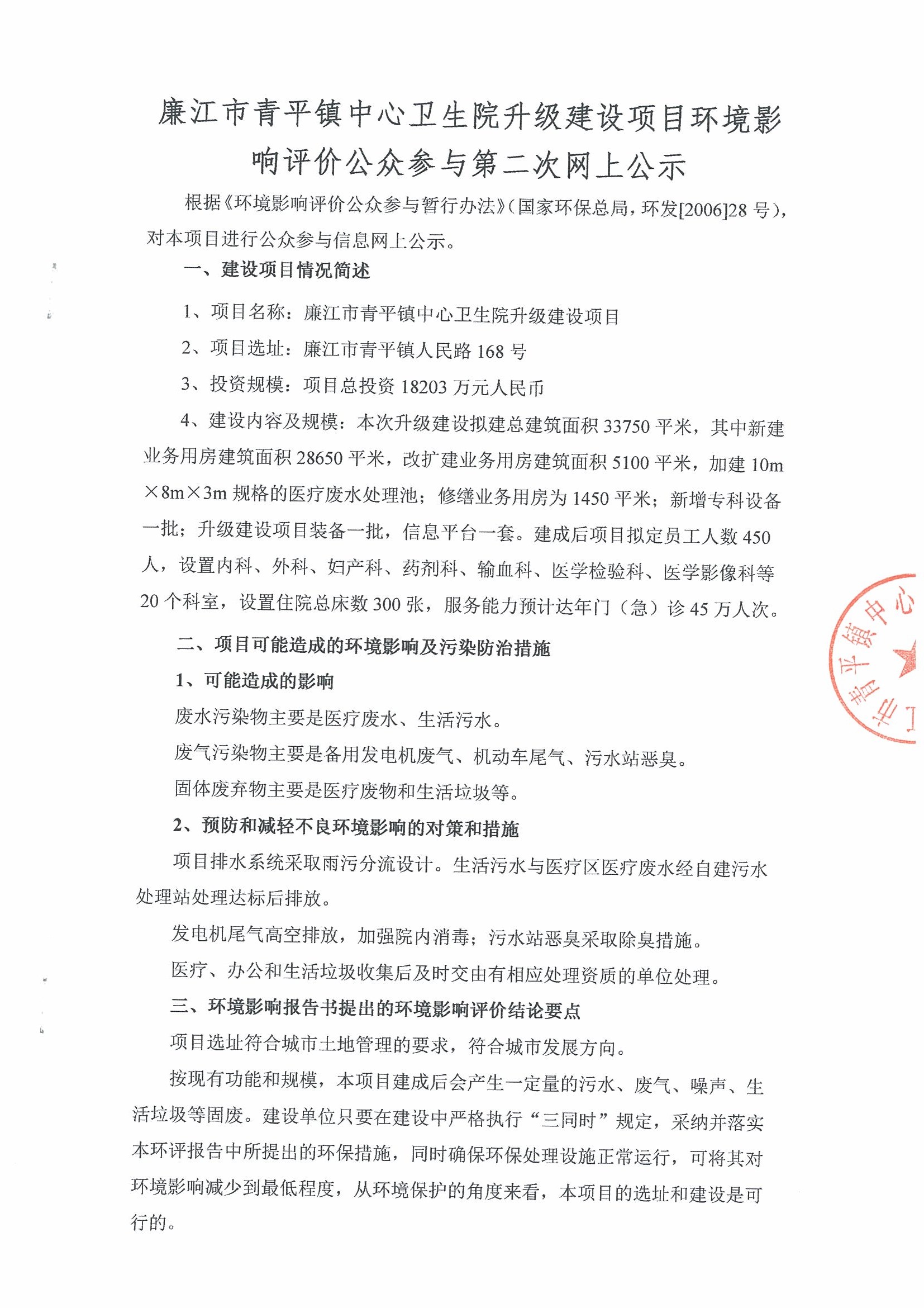 廉江市青平镇中心卫生院升级建设项目环评第二次网上公示