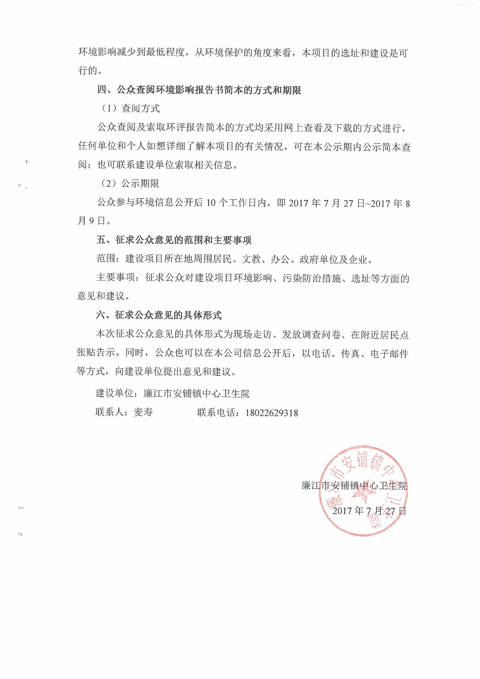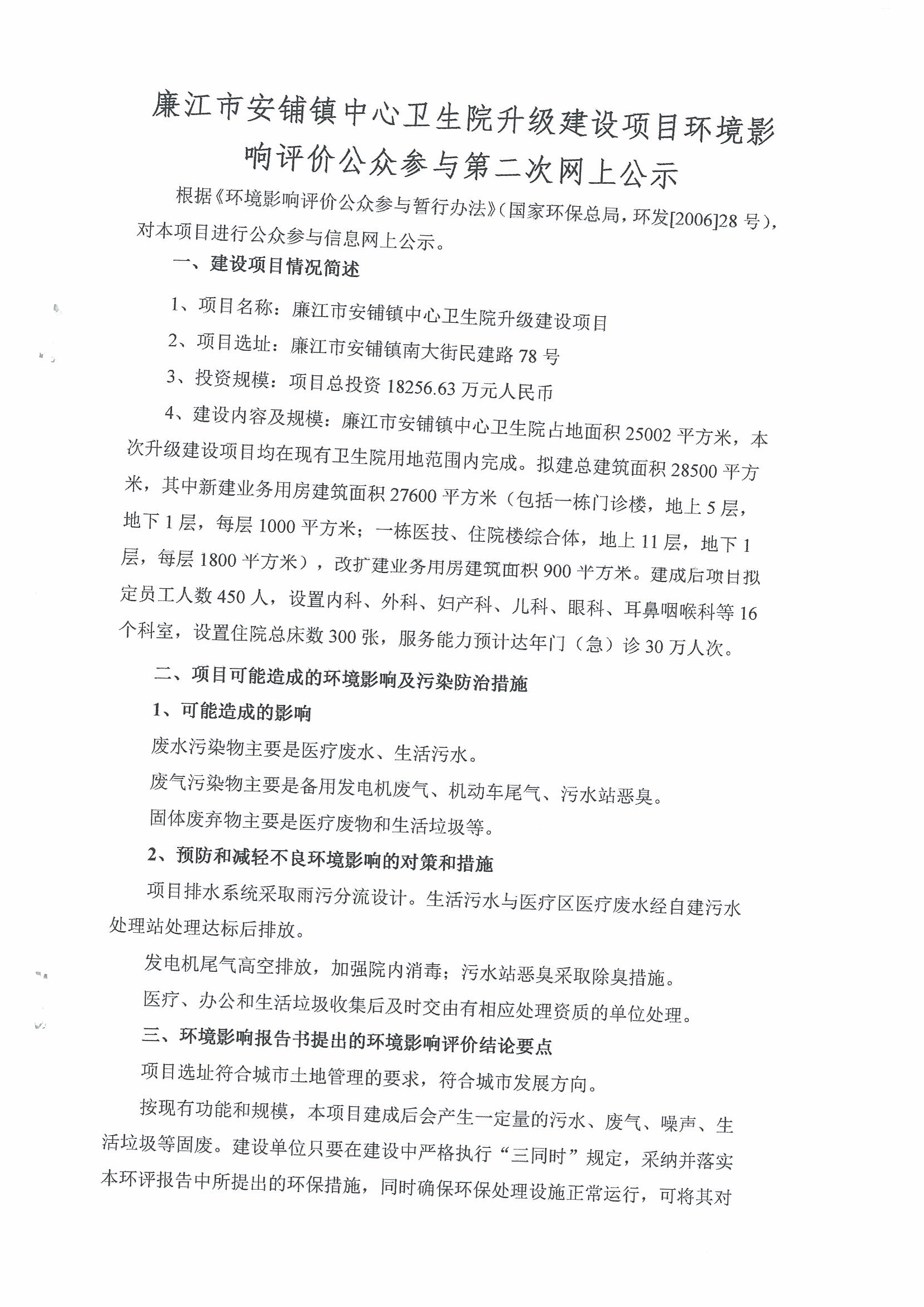 廉江市安铺镇中心卫生院升级建设项目环评第二次网上公示