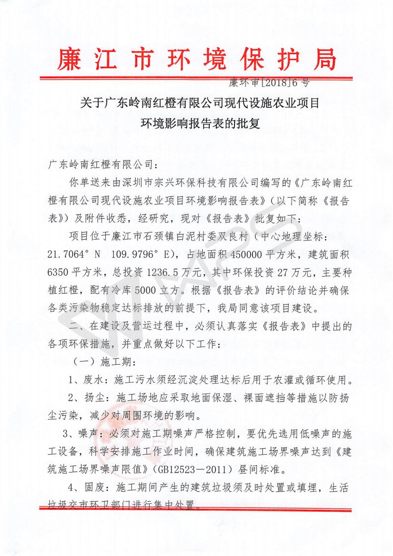 关于广东岭南红橙有限公司现代设施农业项目 环境影响报告表的批复
