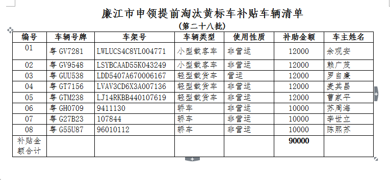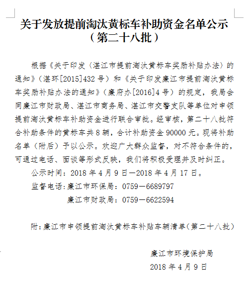 关于发放提前淘汰黄标车补助资金名单公示(第二十八批)