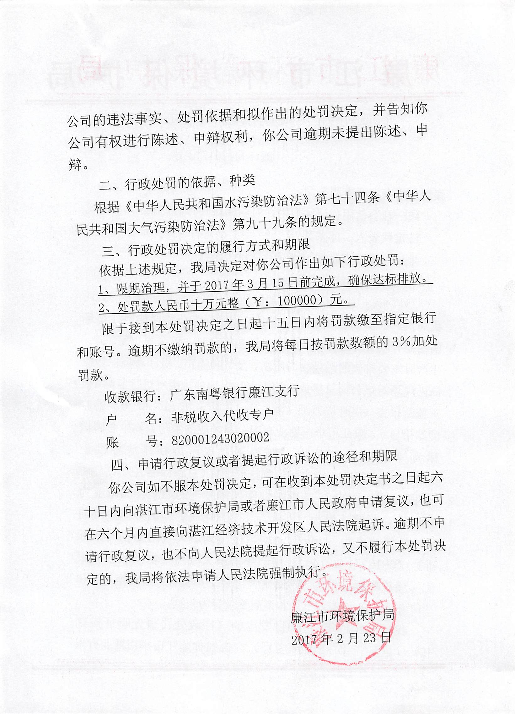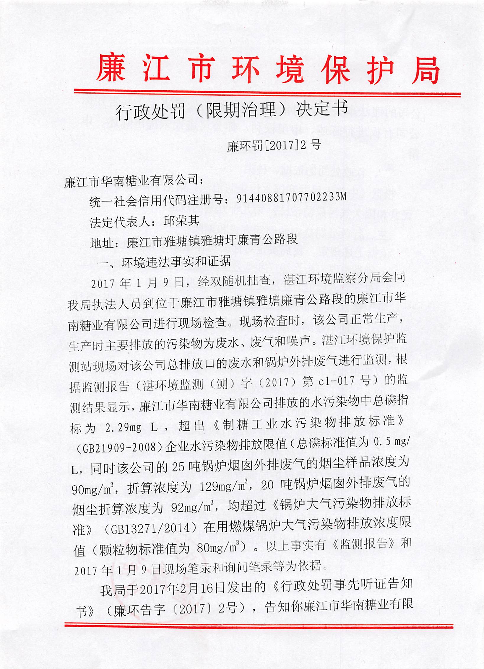 行政处罚决定书(廉江市华南糖业有限公司)