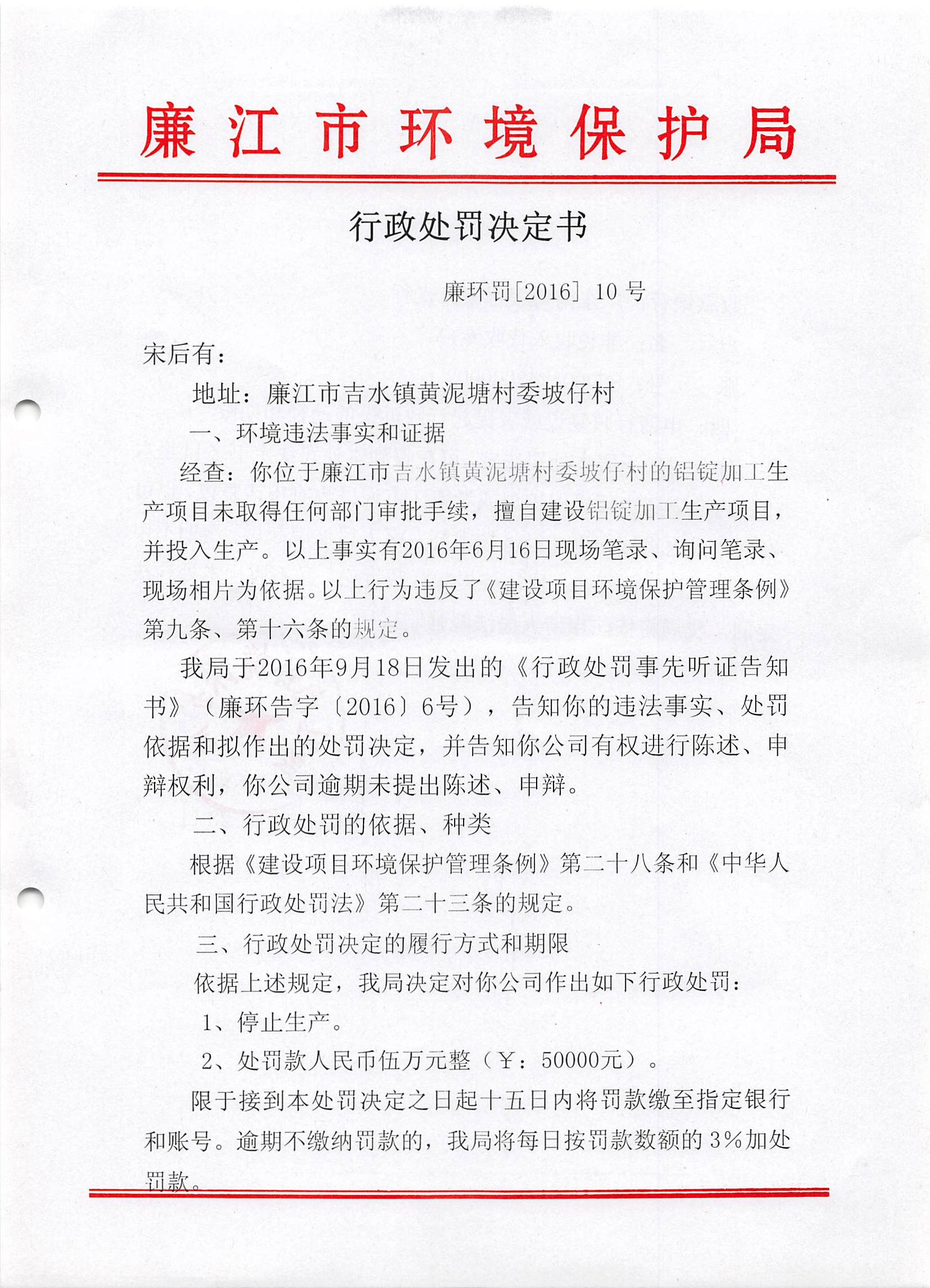 行政处罚决定书(宋后有(廉江市吉水镇黄泥塘村委坡仔村))