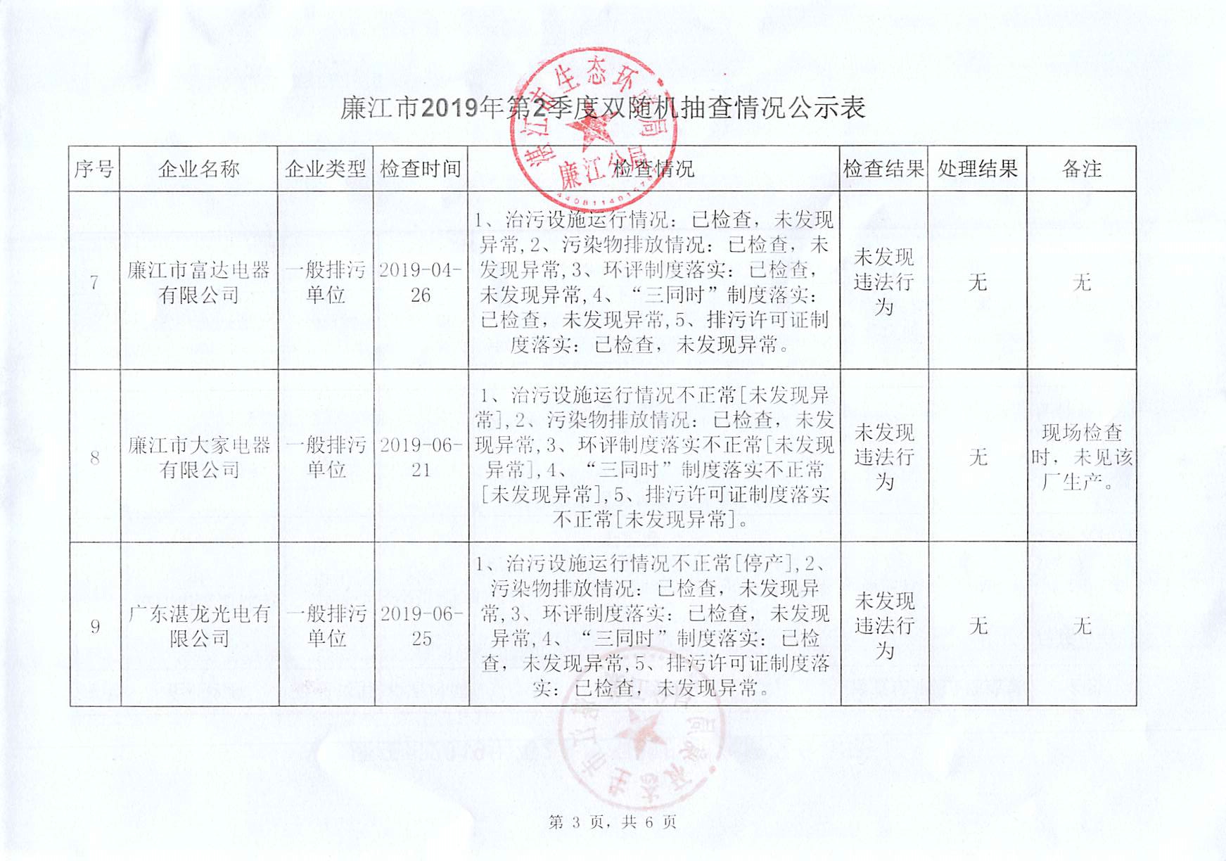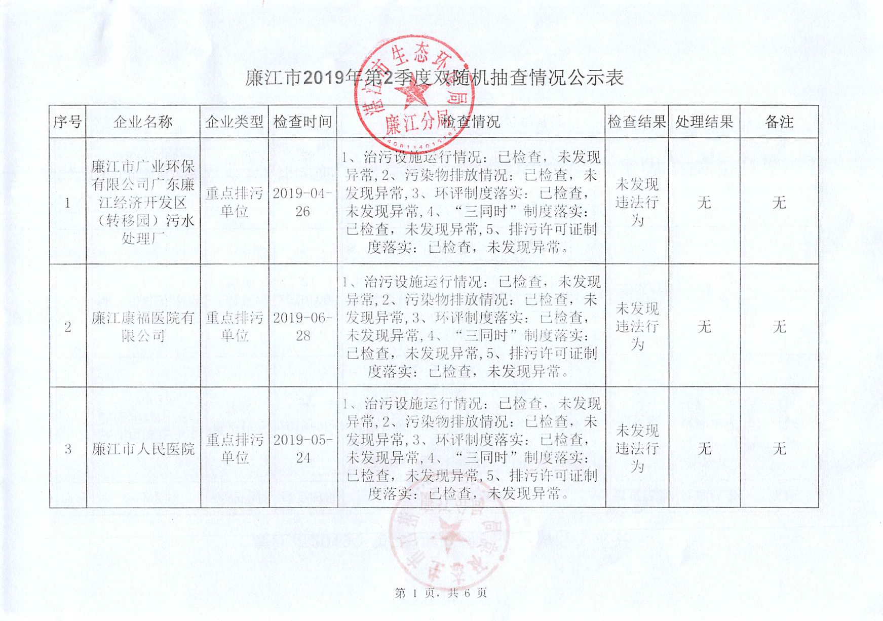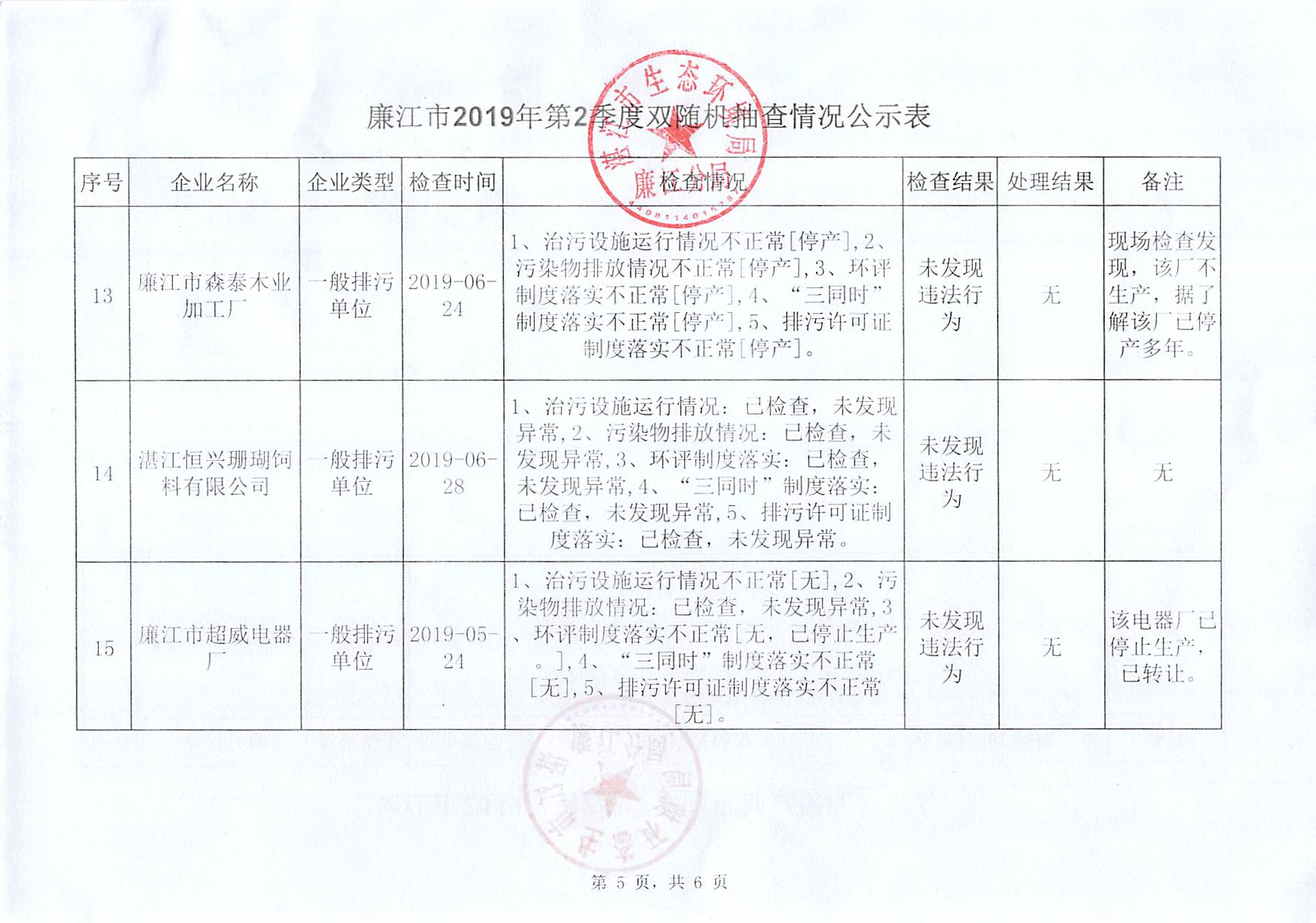 廉江市2019年第二季度双随机抽查情况公示表