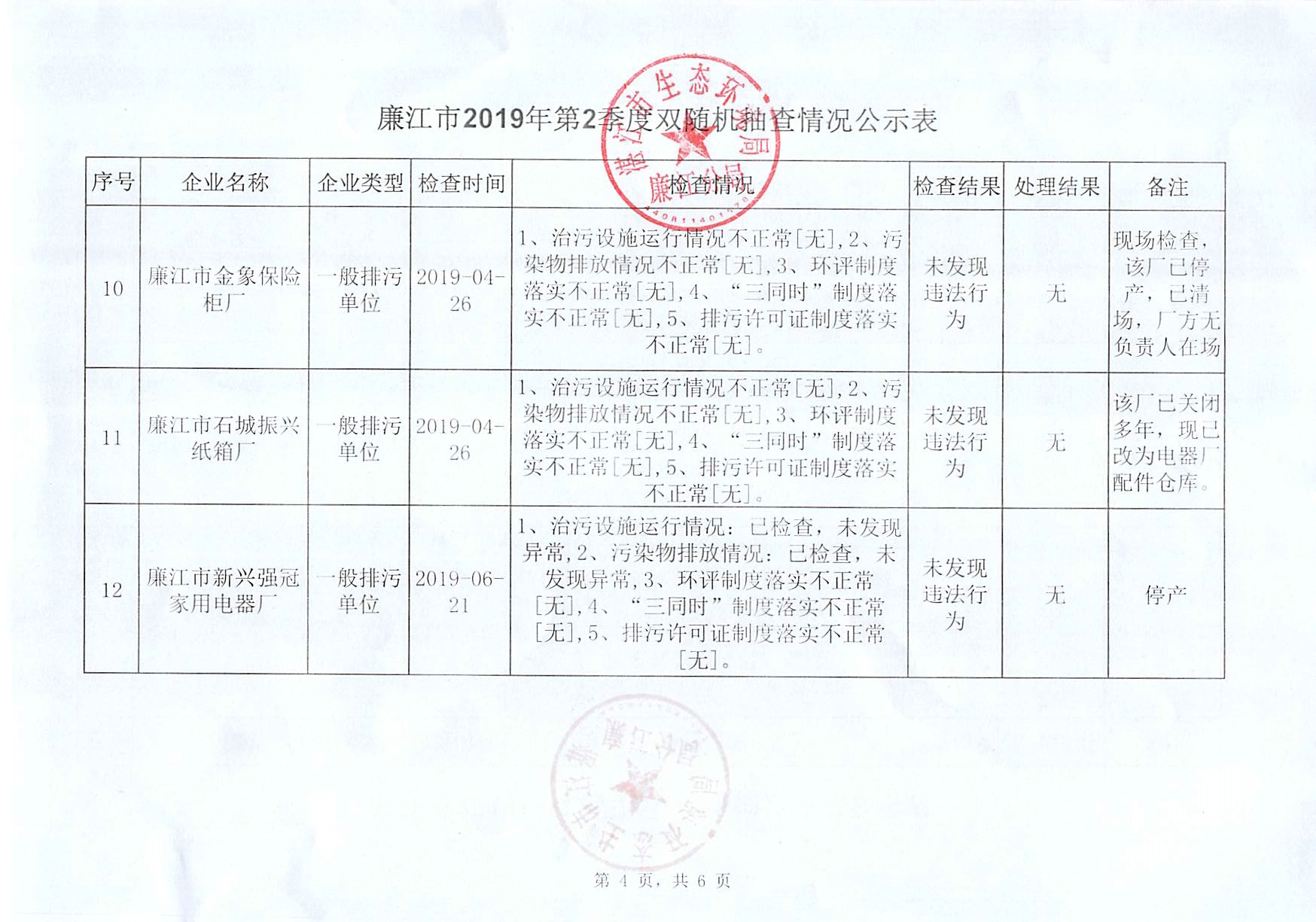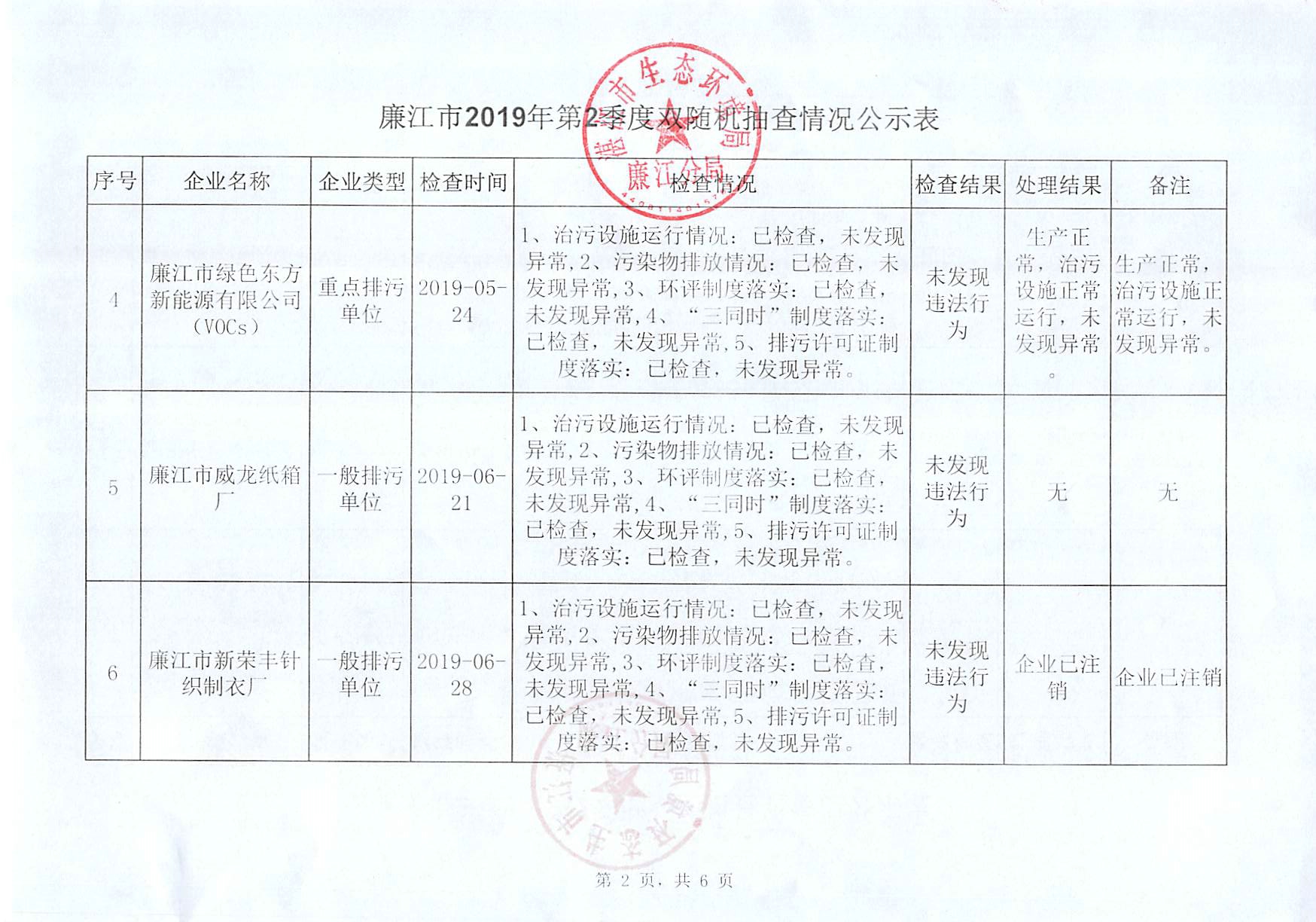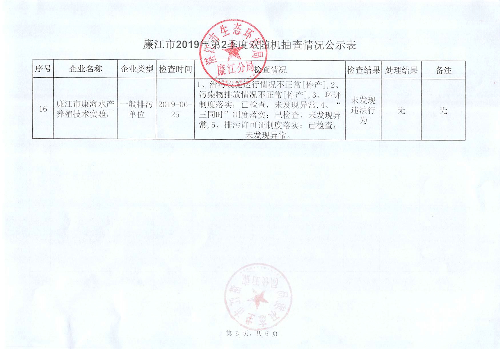 廉江市2019年第二季度双随机抽查情况公示表