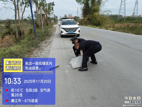 11月20日,廉江市交通运输局执法人员及时清理道路中央障碍物,保障道路安全畅通。