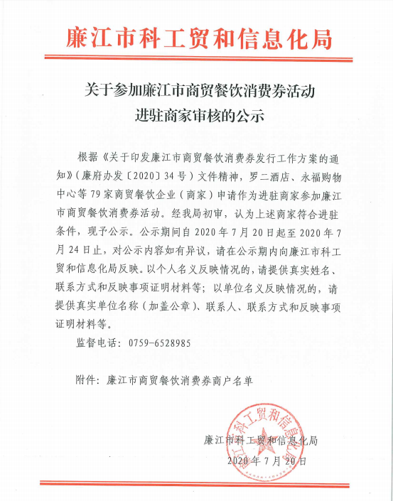 关于参加廉江市商贸餐饮消费券活动进驻商家审核的公示
