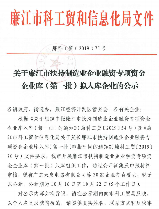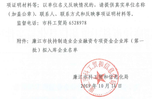 关于廉江市扶持制造业企业融资专项资金企业库(第一批)拟入库企业的公示