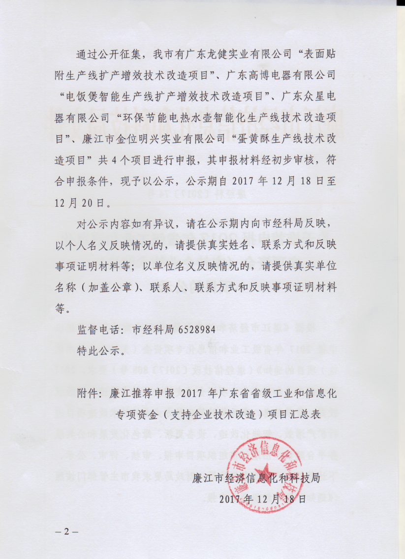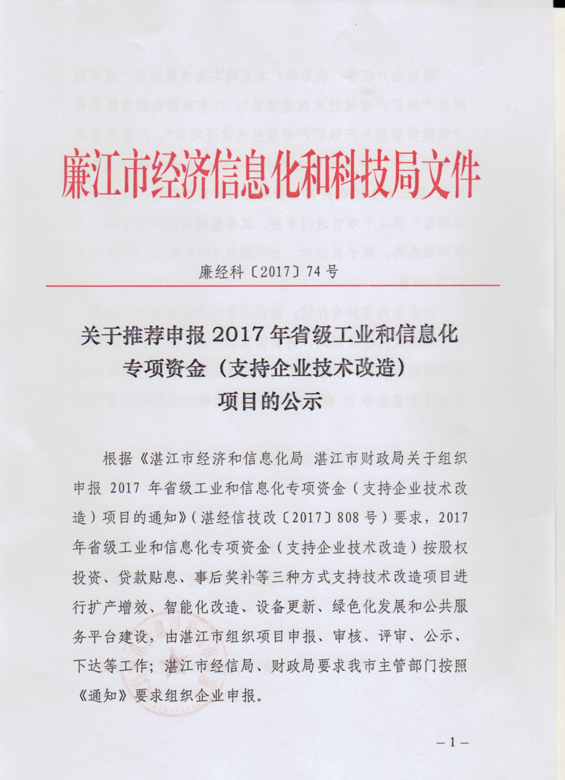 关于推荐申报2017年省级工业和信息化专项资金(支持企业技术改造)项目的公示