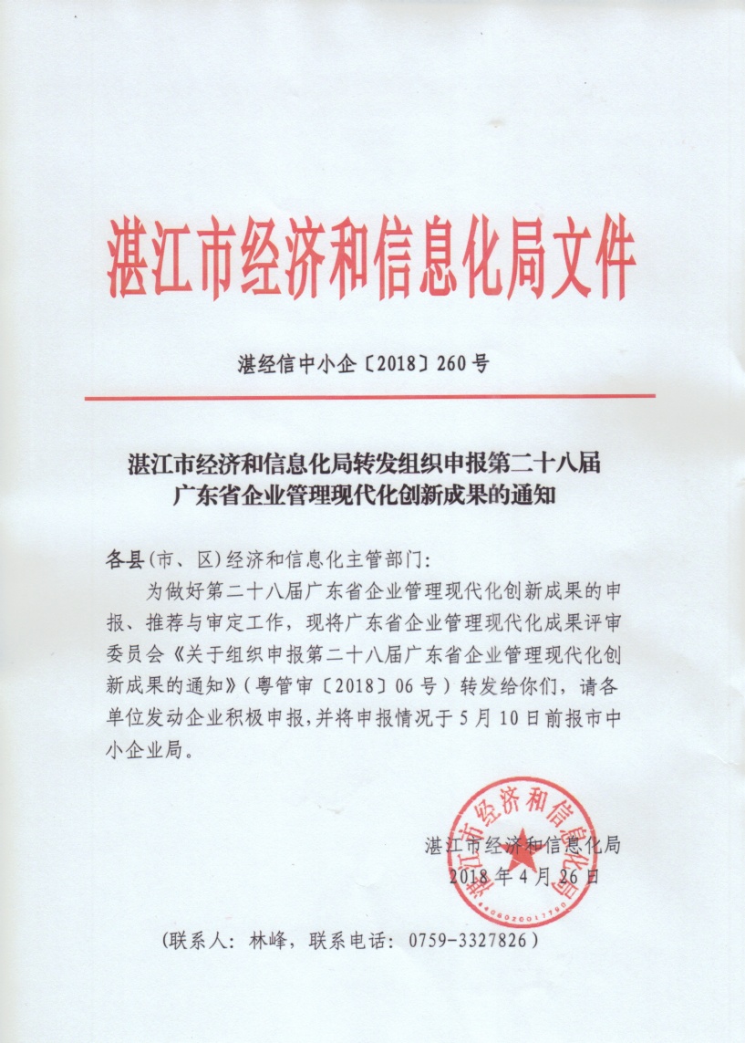 湛江市经济和信息化局转发组织申报第二十八届广东省企业管理现代化创新成果的通知