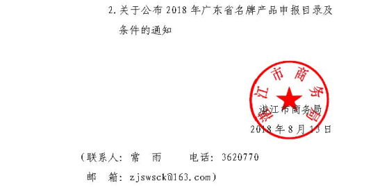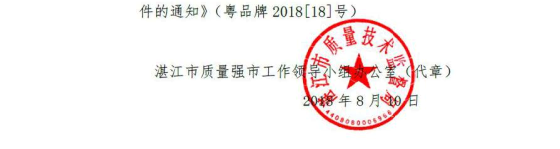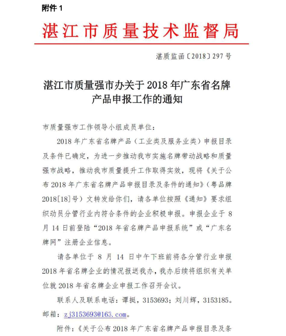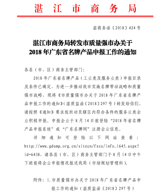 湛江市商务局转发市质量强市办关于2018年广东省名牌产品申报工作的通知