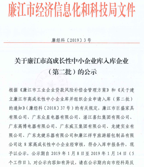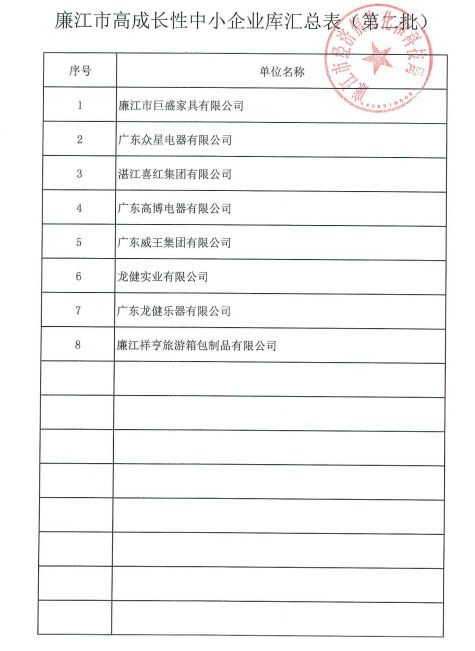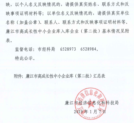 关于廉江市高成长性中小企业库入库企业(第二批)的公示