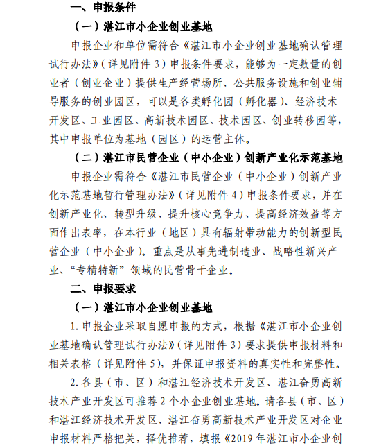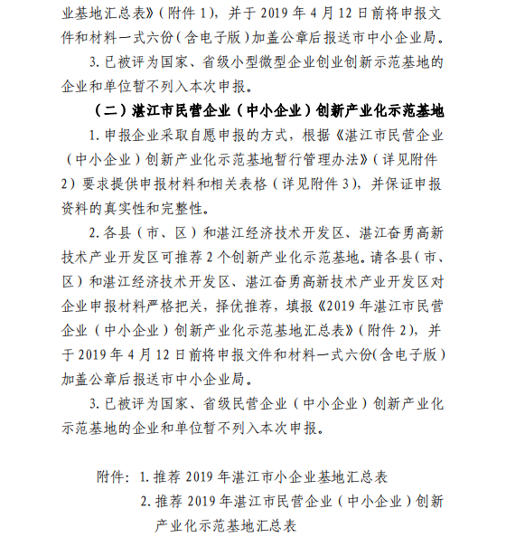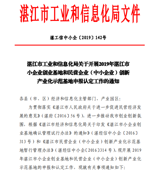 关于开展2019年湛江市小企业创业基地和民营企业(中小企业)创新产业化示范基地申报认定工作的通知