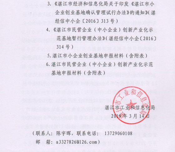 附件:湛江市工业和信息化局关于开展2019年湛江市小企业创业基地和民营企业(中小企业)创新产业化示范基地申报认定工作的通知