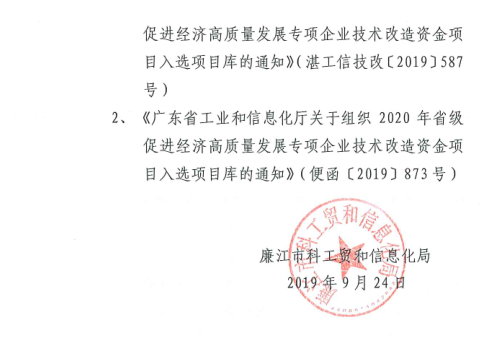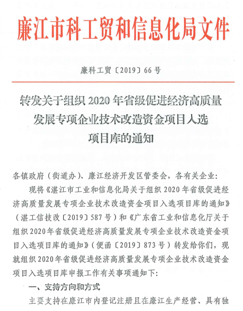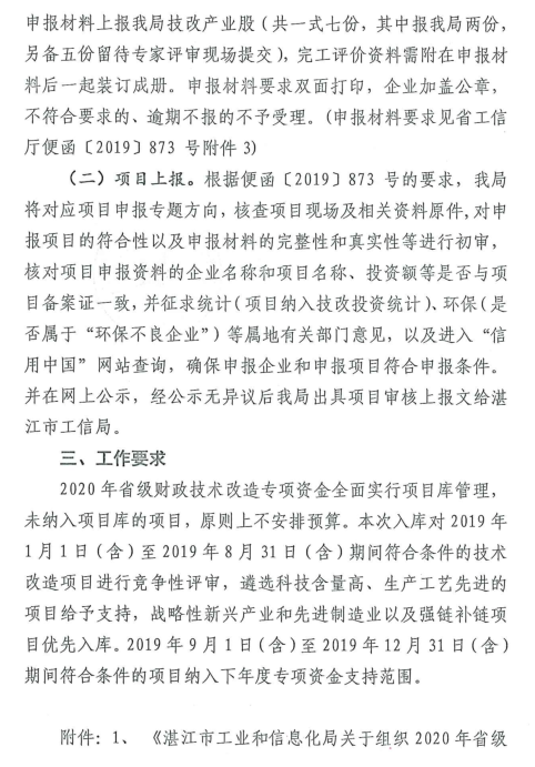 附件2:【便函〔2019〕873号】广东省工业和信息化厅关于组织2020年省级促进经济高质量发展专项企业技术改造资金项目入选项目库的通知(以此件为准)