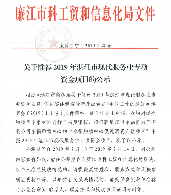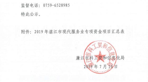 关于推荐2019年湛江市现代服务业专项资金项目的公示
