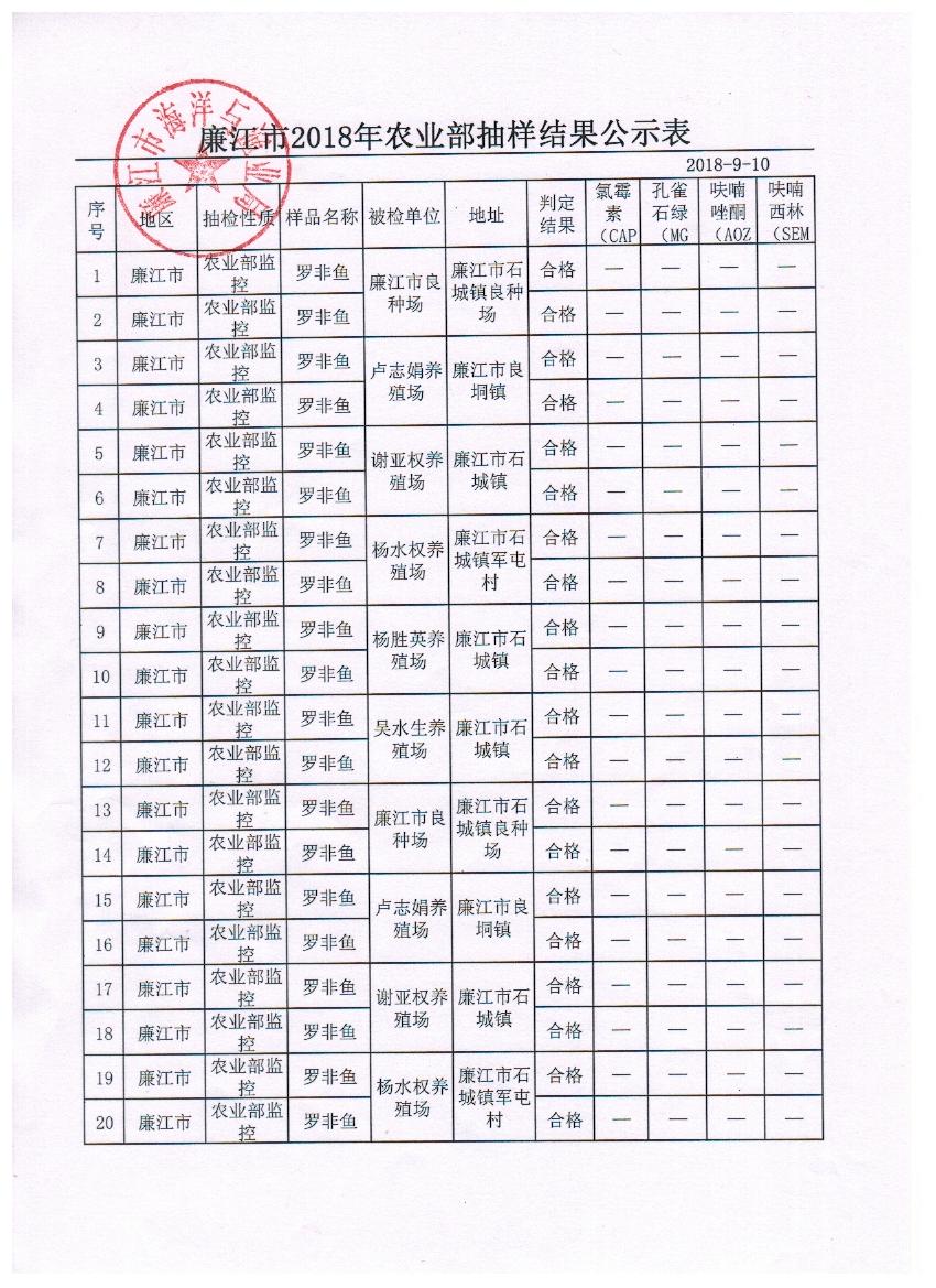 廉江市2018年农业部抽样结果公示表