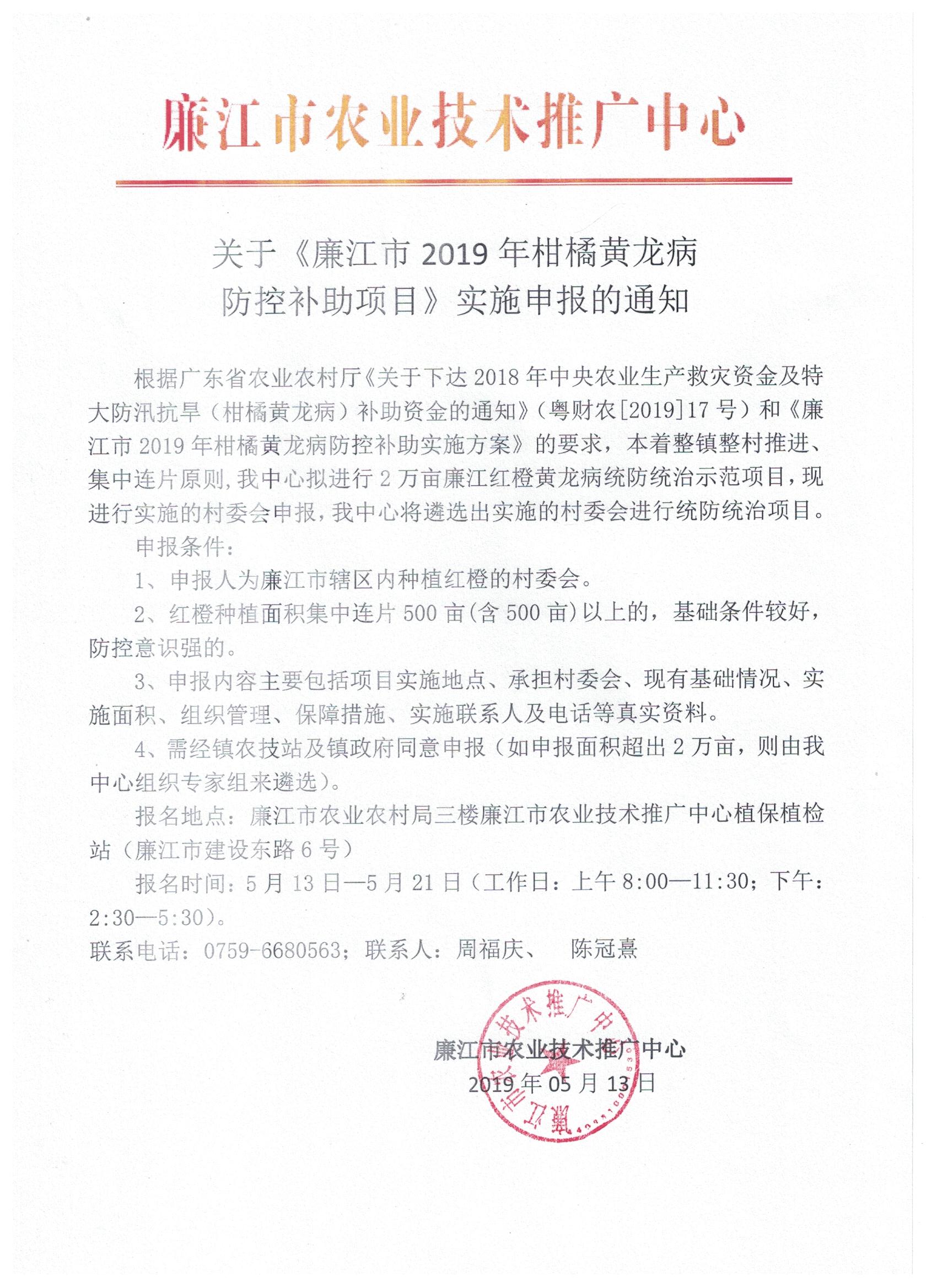 关于《廉江市2019年柑橘黄龙病防控补助项目》实施申报的通知