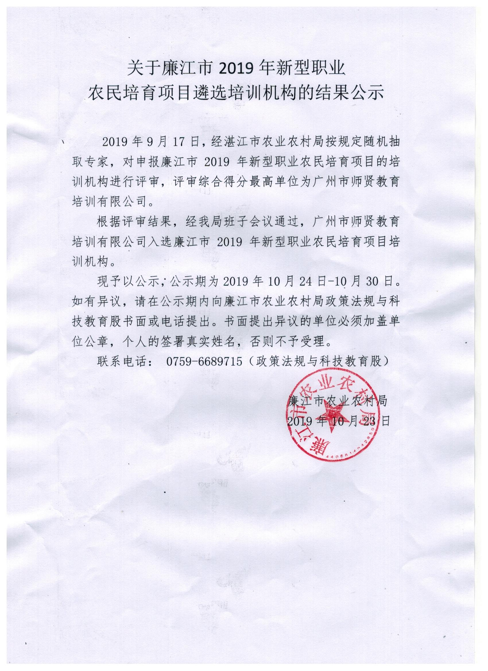 关于廉江市2019年新型职业农民培育项目遴选培训机构的结果公示