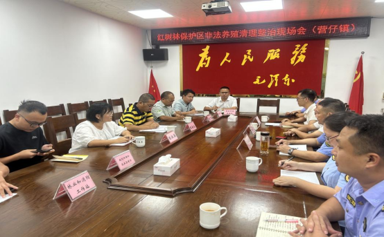 为纵深推进红树林保护区生态保护工作,坚决依法打击非法侵占保护区养殖等破坏生态环境的违法行为,高效推动非法养殖清退任务落地见效,2025年9月10日,廉江市在营仔镇人民政府组织召开红树林保护区非法养殖清理整治现场会。会议由廉江市农业农村局党组副书记、副局长梁永健主持,营仔镇委书记刘师、镇委副书记、镇长杨侃,湛江红树林国家级自然保护区管理局站长林广旋,以及相关施工单位负责人等共同参会,凝聚多方力量部署推进清退工作。