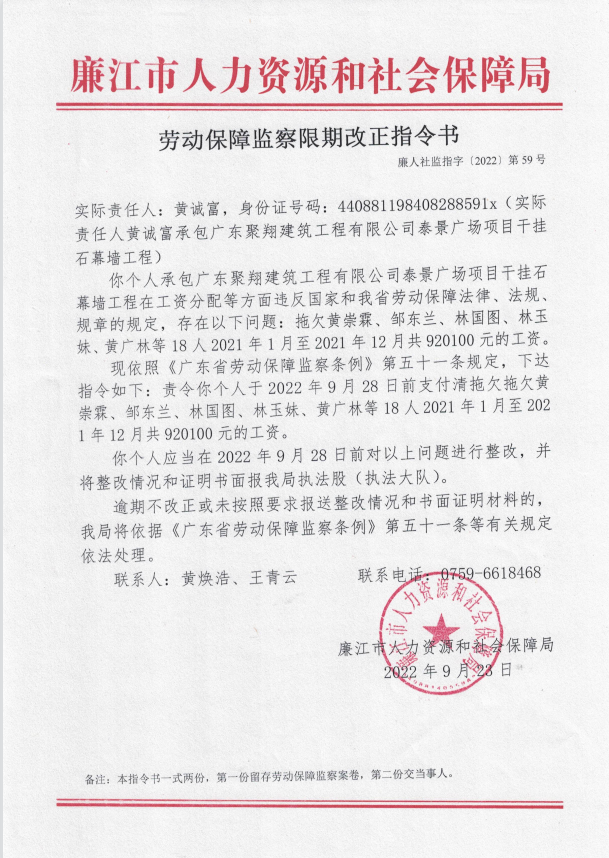 劳动保障监察限期改正指令书(廉人社监指字〔2022〕第59号)