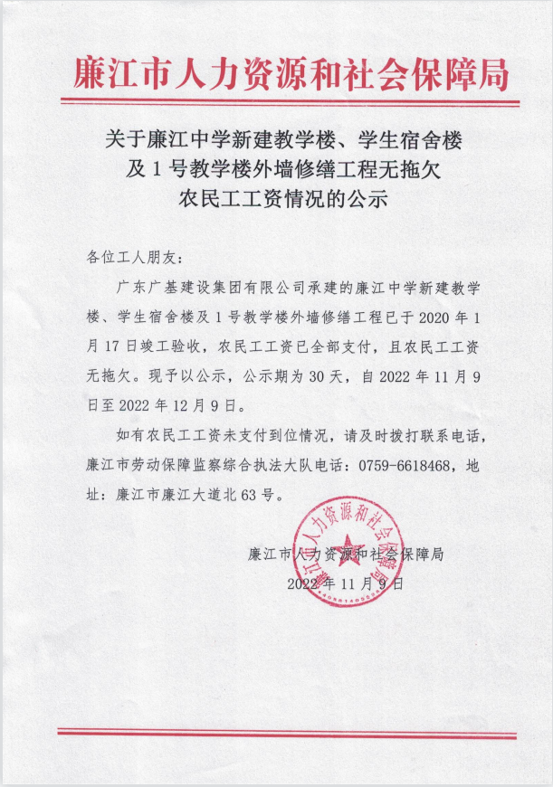 关于廉江中学新建教学楼、学生宿舍楼及1号教学楼外墙修缮工程无拖欠农民工工资情况的公示