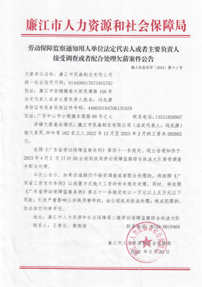 劳动保障监察通知用人单位法定代表人或者主要负责人接受调查或者配合处理欠薪案件公告(廉人社监告字〔2023〕第7-1号)