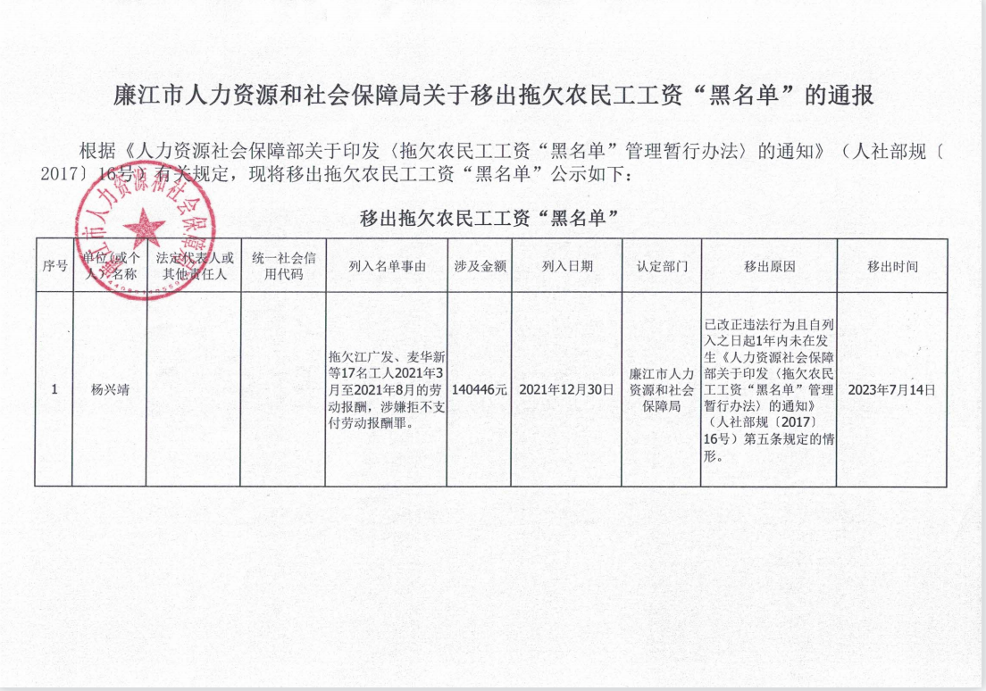 廉江市人力资源和社会保障局关于移出拖欠农民工工资“黑名单”的通报