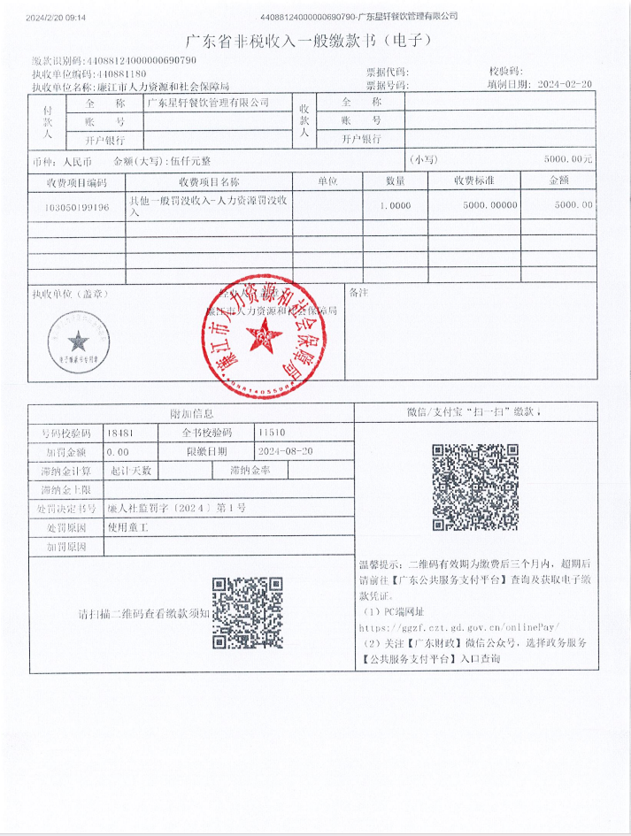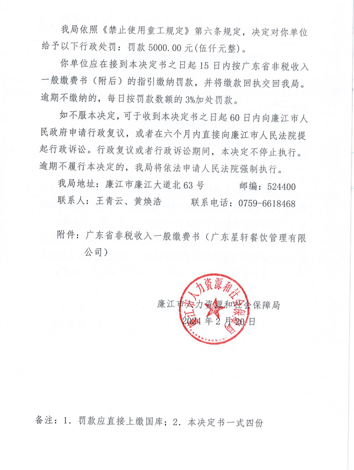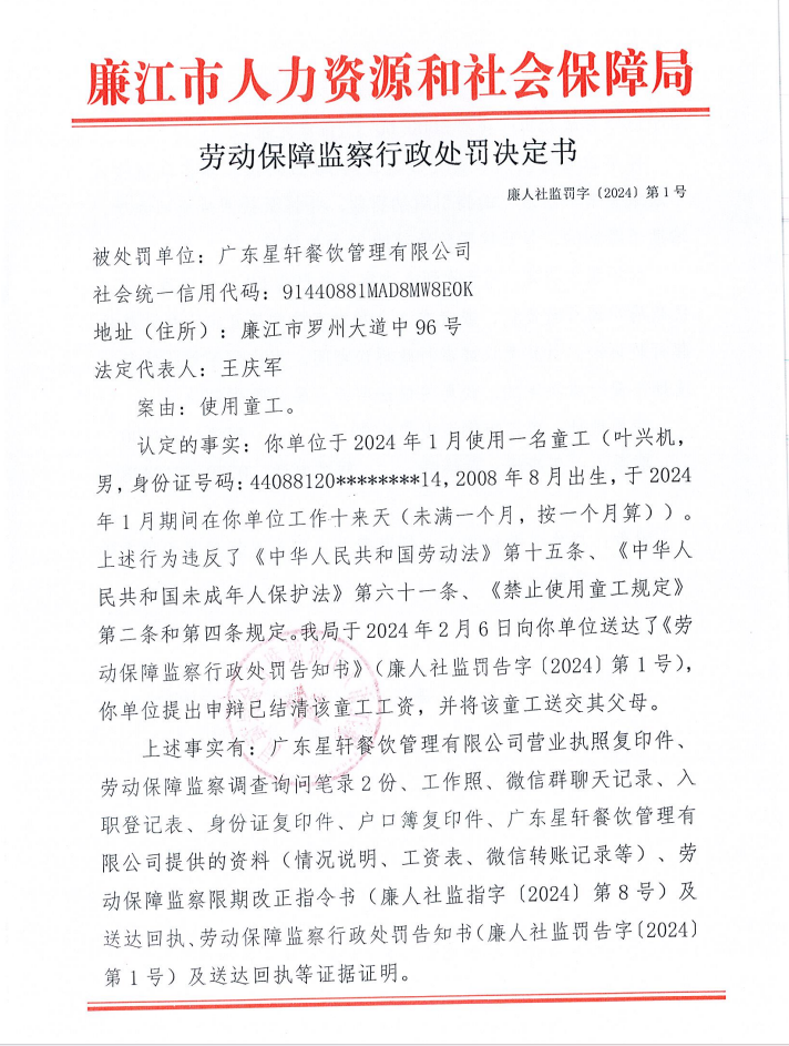劳动保障监察行政处罚决定书(廉人社监罚字〔2024〕第1号)