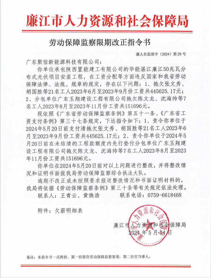 劳动保障监察限期改正指令书 (廉人社监指字〔2024〕第29号)