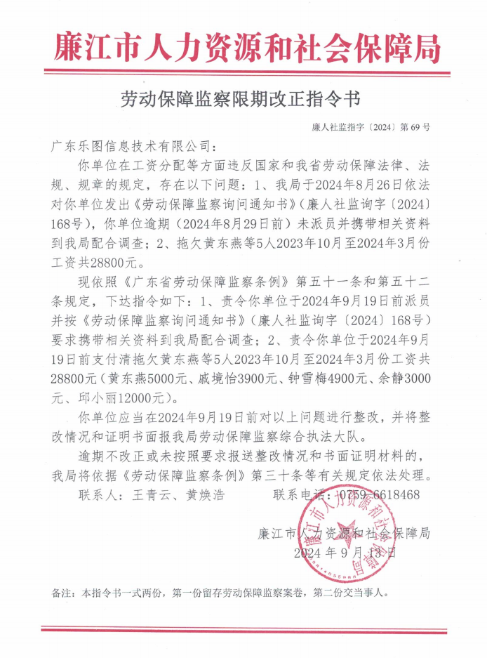 劳动保障监察限期改正指令书(廉人社监指字〔2024〕第69号)
