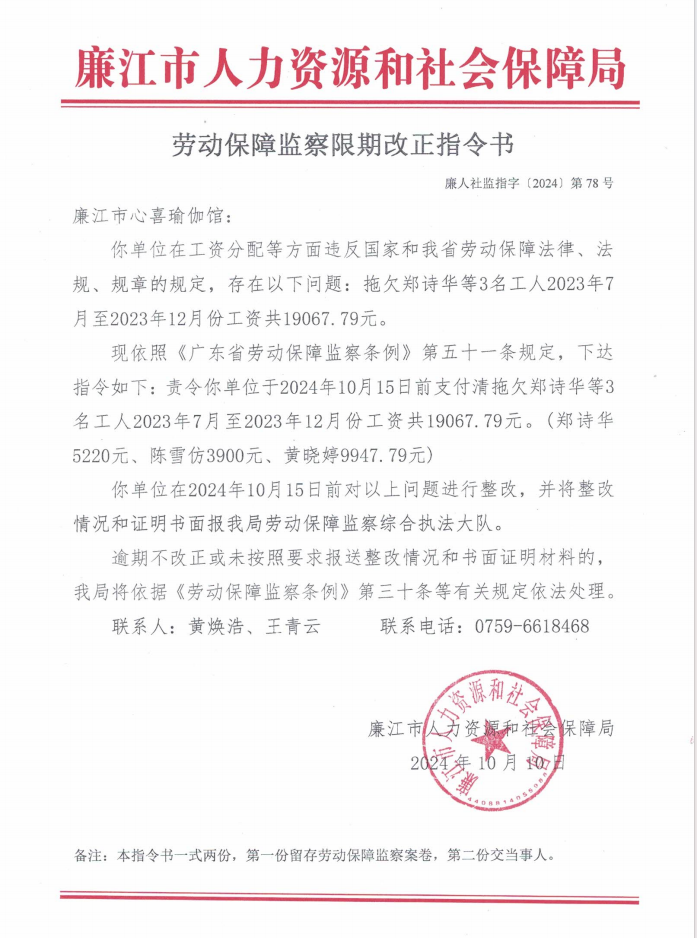 劳动保障监察限期改正指令书(廉人社监指字〔2024〕第78号)