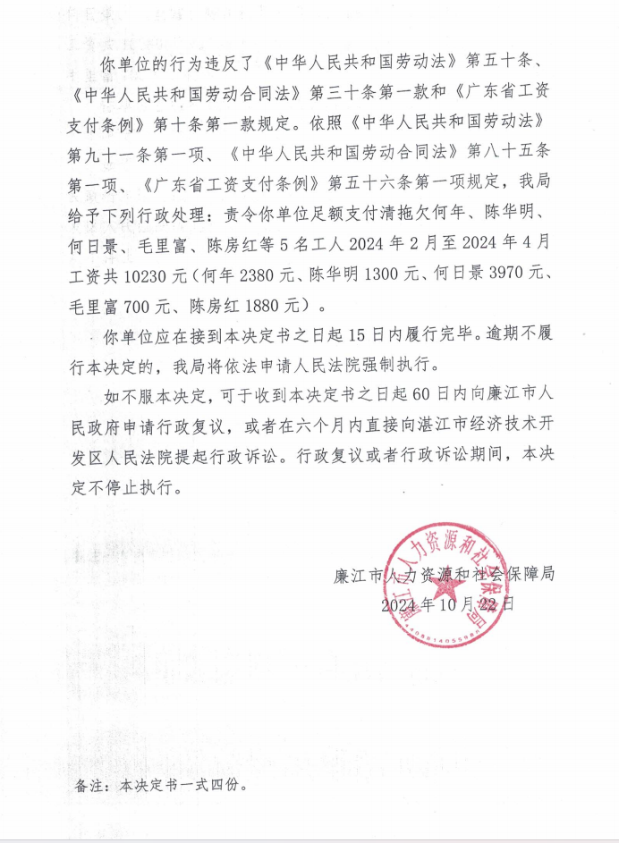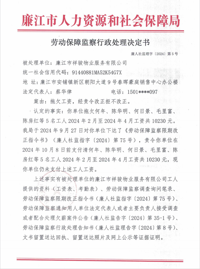 劳动保障监察行政处理决定书(廉人社监理字〔2024〕第5号)