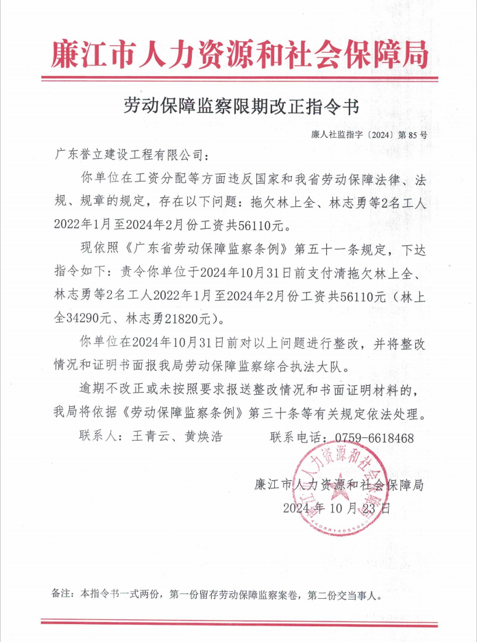 劳动保障监察限期改正指令书 (廉人社监指〔2024〕第85号)