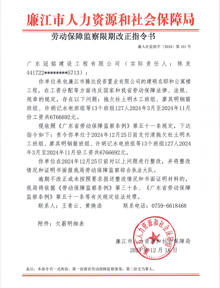 劳动保障监察限期改正指令书 (廉人社监指〔2024〕第101号)