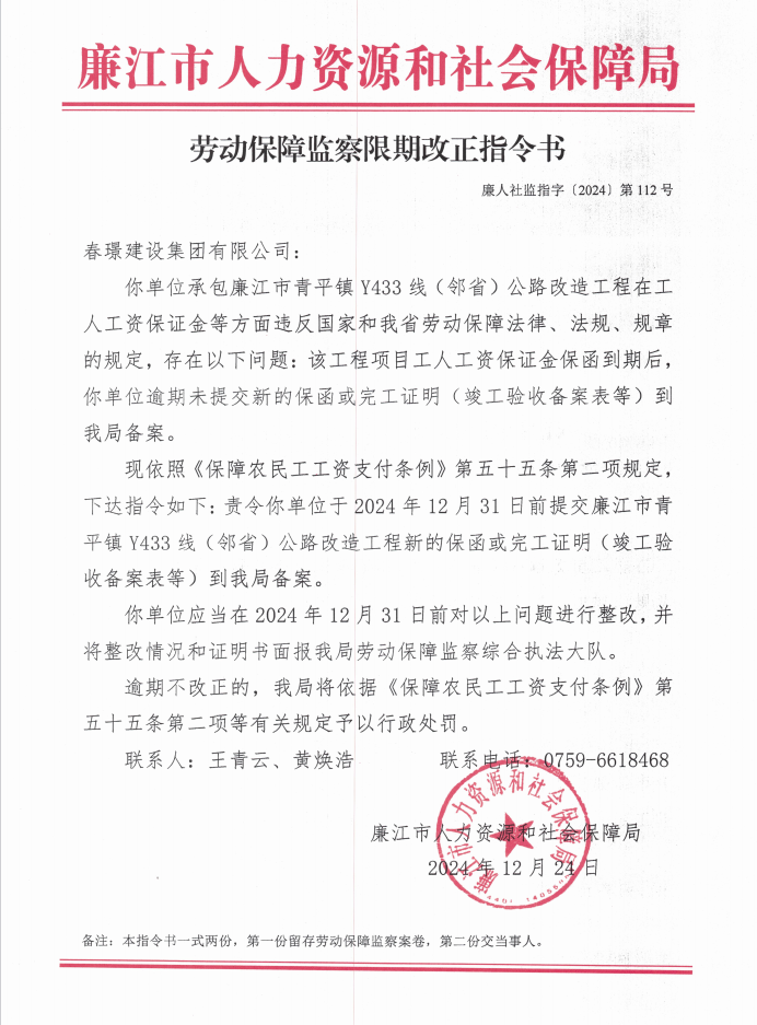 劳动保障监察限期改正指令书 (廉人社监指〔2024〕第112号)