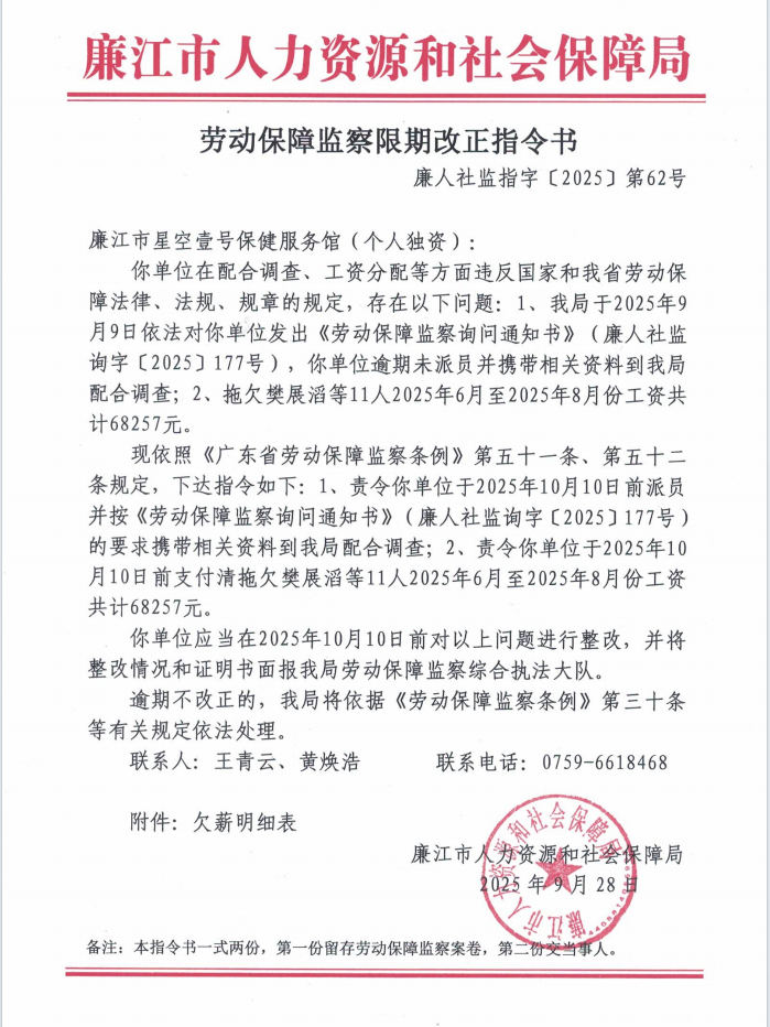 劳动保障监察限期改正指令书 (廉人社监指字〔2025〕第62号)