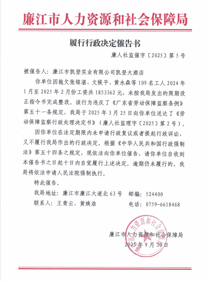 履行行政决定催告书(廉人社监催字〔2025〕第5号)