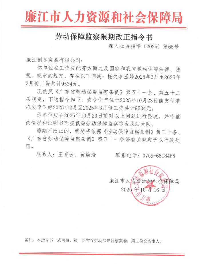 劳动保障监察限期改正指令书 (廉人社监指字〔2025〕第65号)