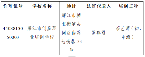 根据《中华人民共和国民办教育促进法》、《中华人民共和国民办教育促进法实施条例》规定,廉江市创星职业培训学校(统一社会信用代码:524408817510592737)因无法继续经营,机构决策者决定解散,向我局申请办理注销其《办学许可证》。经廉江市人力资源和社会保障局研究决定,同意该校终止办学和注销办学许可申请,并收回其办学许可证。现公示如下:
