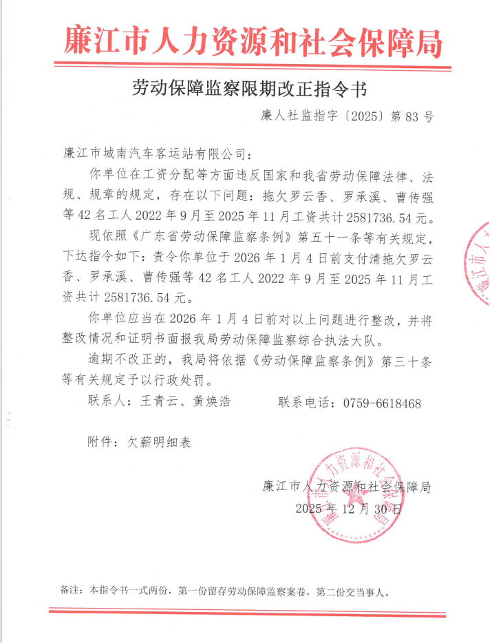 劳动保障监察限期改正指令书 (廉人社监指字〔2025〕第83号)