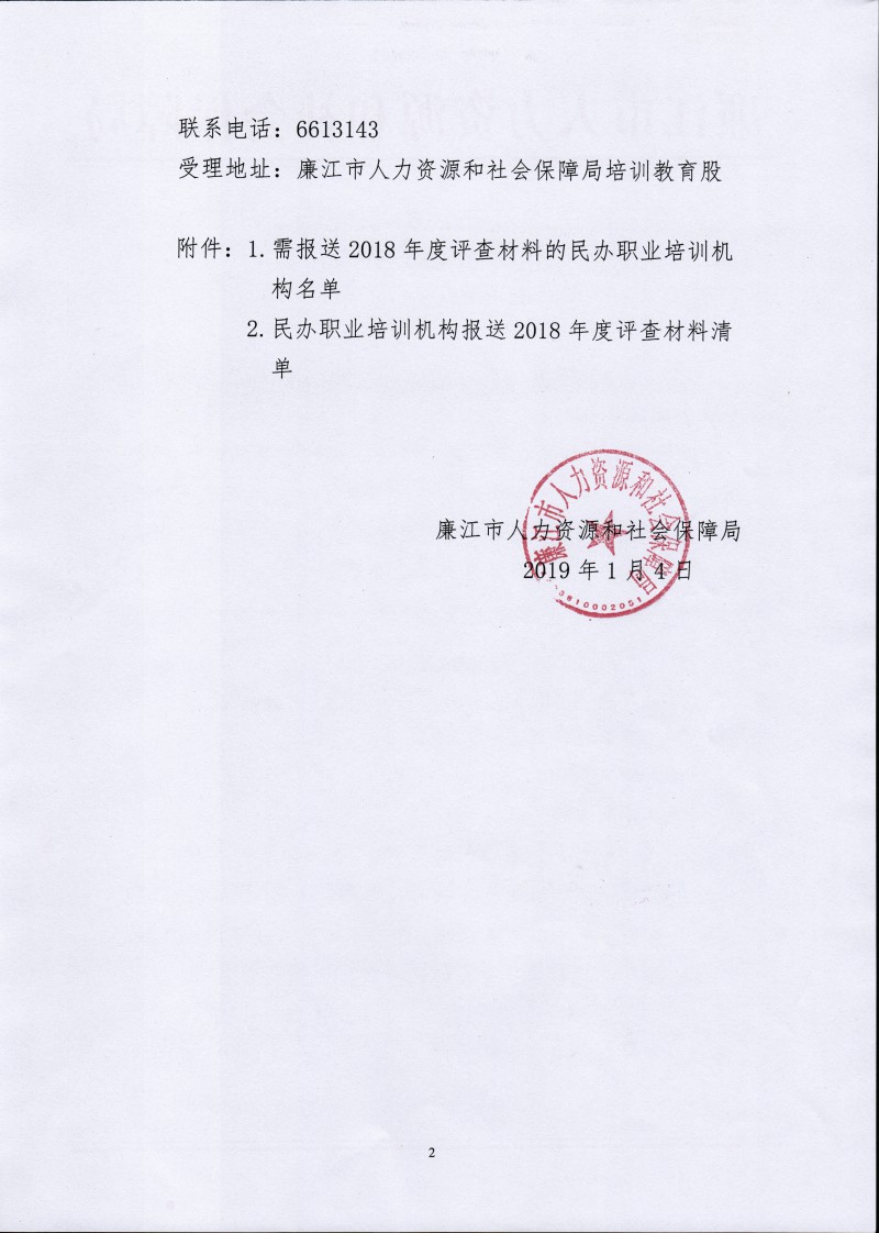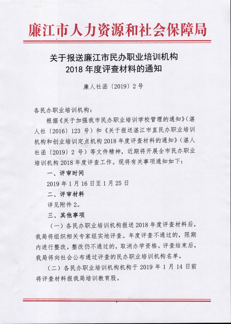 关于报送廉江市民办职业培训机构2018年度评查材料的通知