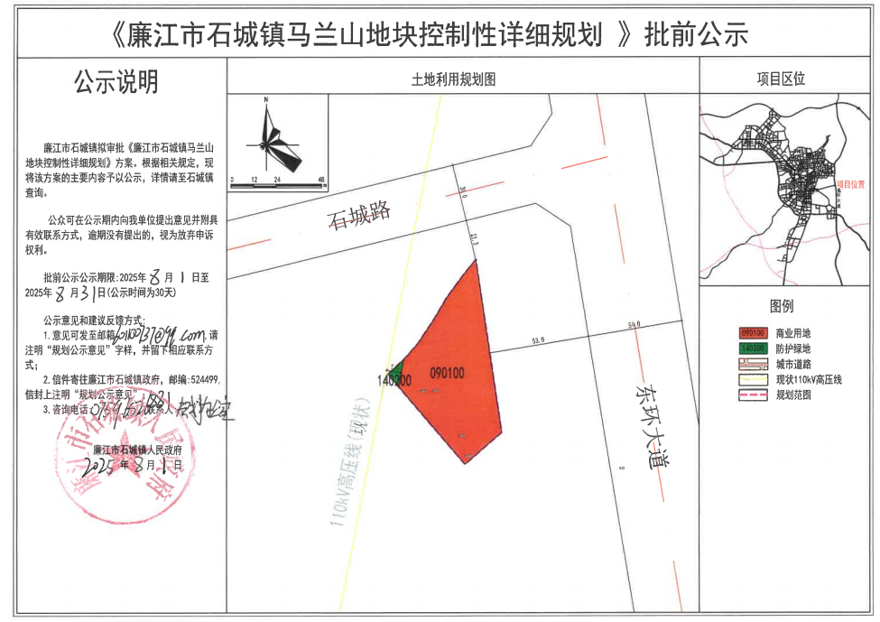 《廉江市石城镇马兰山地块控制性详细规划》批前公示