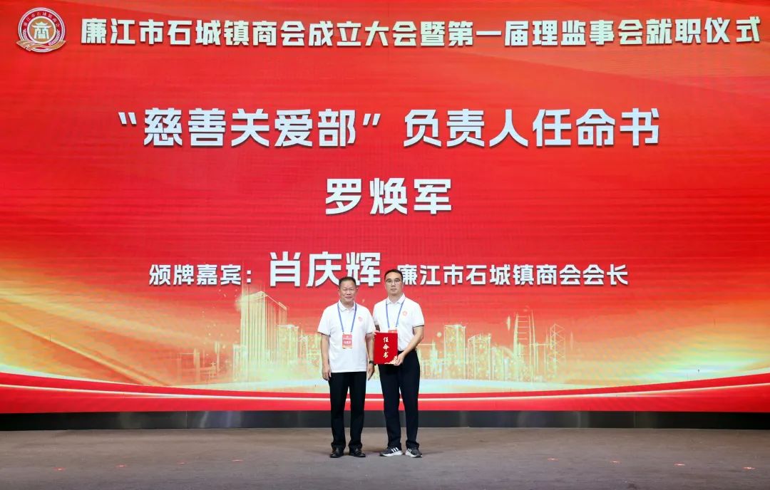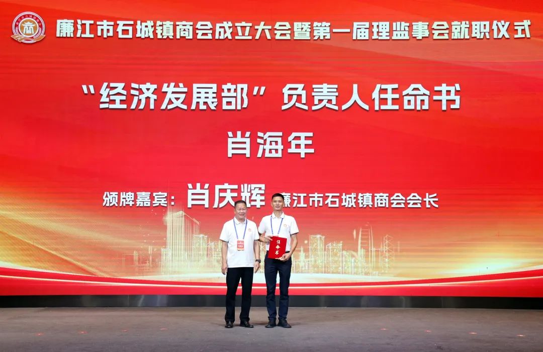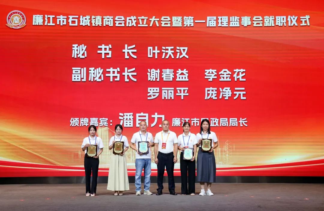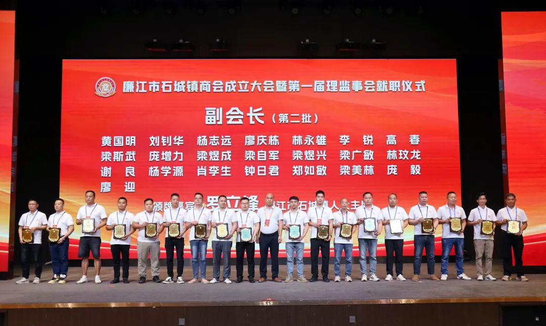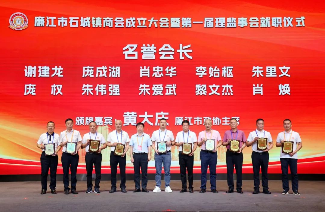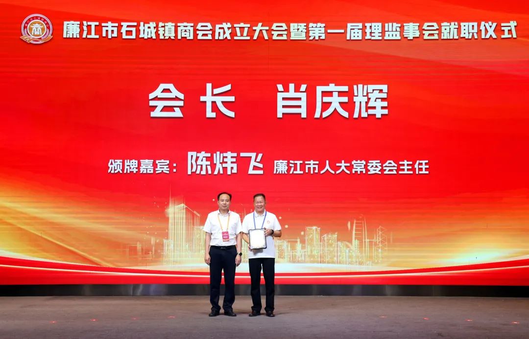 市人大常委会党组书记、主任陈炜飞,市政协党组书记、主席黄大庆,市人大常委会副主任徐向阳、市政协副主席黄坤良等领导为石城镇商会揭牌,并为商会会长肖庆辉;名誉会长谢建龙、庞成湖、肖忠华、李始枢、朱里文、庞权、朱伟强、朱爱武、黎文杰、肖焕;执行会长罗焕军、谢树盛、谢杰夫;以及常务副会长、监事长、秘书长、副秘书长、副会长、理事等颁发当选牌匾和任命书。