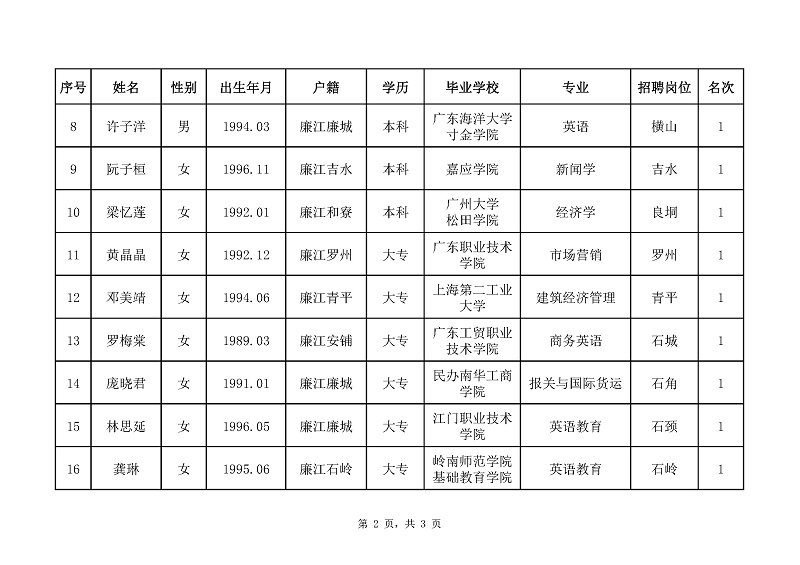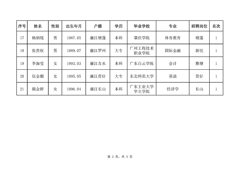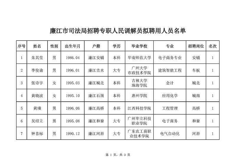 根据《廉江市司法局公开招聘专职人民调解员公告》规定,经报名、资格审查、笔试、面试、体检、政审等程序,拟聘用朱其堂、李俊谕、张诗宇等21名同志为廉江市司法局专职人民调解员(见附件),现予以公示。