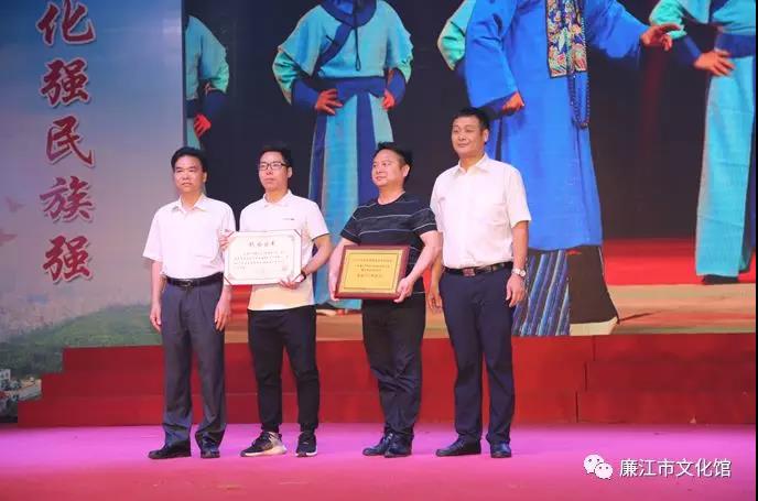 湛江市文化广电新闻出版局党组成员、副局长吴上超,中共廉江市委常委、市委办主任关维荣为廉江市新自力粤剧有限公司、廉江市剑清粤剧团颁发牌匾和证书。