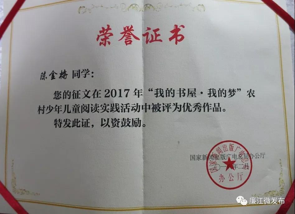 在10日举行的2018年南国书香节廉江分会场廉江书展开幕仪式暨2018“书香廉江”全民阅读活动启动仪式上,一份来自国家新闻出版广电总局的表彰通报让现场掌声雷动——在国家新闻出版广电总局举办的“我的书屋·我的梦”农村少年儿童阅读实践活动征文中,廉江市新民镇新圩小学六年级的陈金梅同学获得2017年度优秀征文奖。她是我省5名获奖者中唯一一名来自湛江的参赛者。