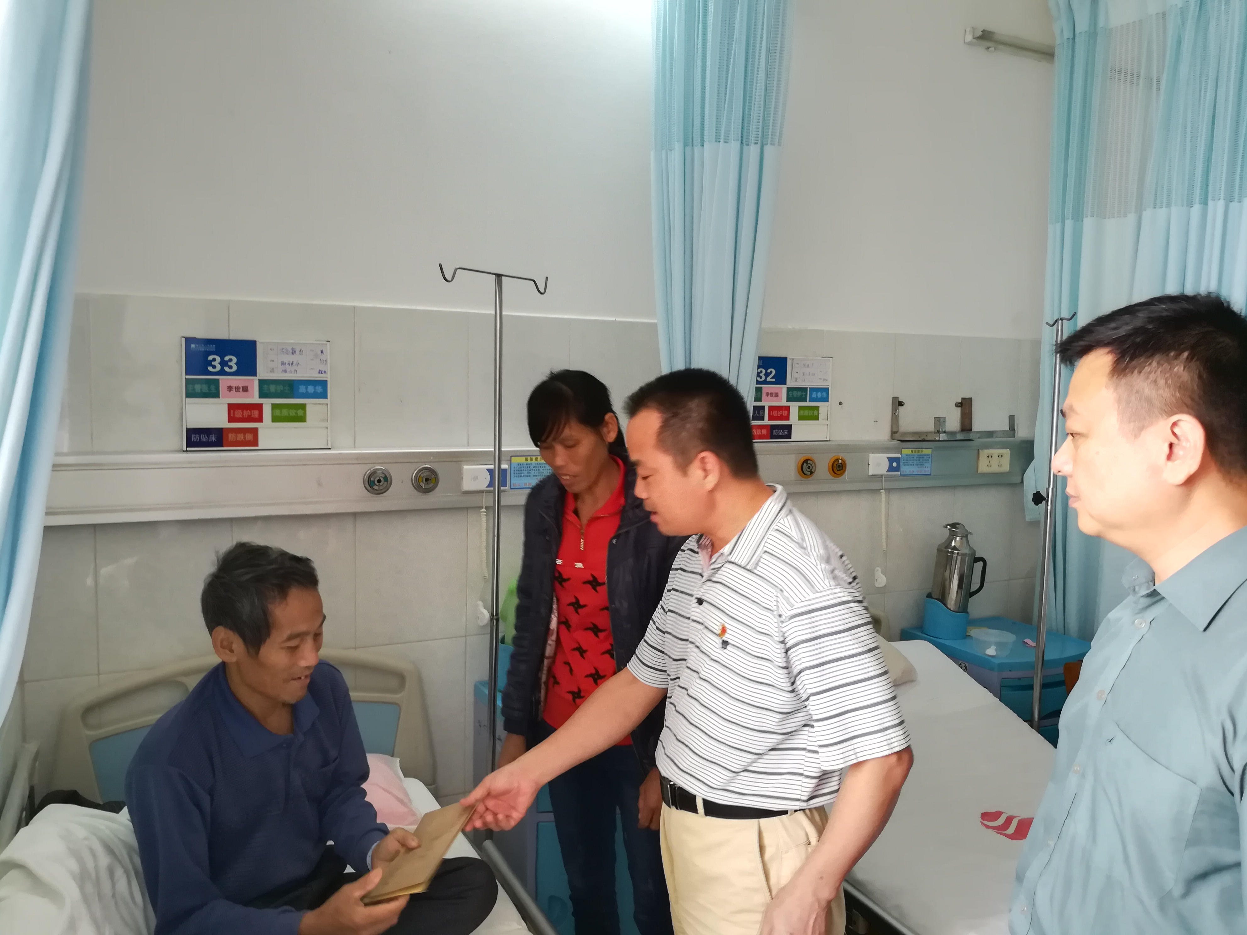作为驻平垌村的帮扶单位,廉江市卫生监督所所长陈其通在了解贫困户病情后,迅速召开会议,专题研究帮扶杨新升事宜,并在12月3日的全体干部职工大会上发出向贫困户杨新升捐款献爱心的倡议,得到了与会全体干部职工的积极响应,大家纷纷慷慨解囊,共筹得捐款2250元。会后,陈其通所长带领所领导班子成员、驻村干部、帮扶责任人到医院看望杨新升,并将以单位名义捐的2000元和全体干部职工捐的2250元共4250元送到杨新升的手上,暂时解决了杨新升的燃眉之急,同时嘱咐他安心养病,争取早日康复。除此之外,干部职工还通过微信等自媒体平台,发动社会力量共同来帮助杨新升。目前,杨新升已获得社会捐助1.8万多元。杨新升夫妇对扶贫干部送来的“及时雨”激动万分,流下了泪水,一再感谢领导班子、扶贫干部,以及爱心人士的关心和帮助。